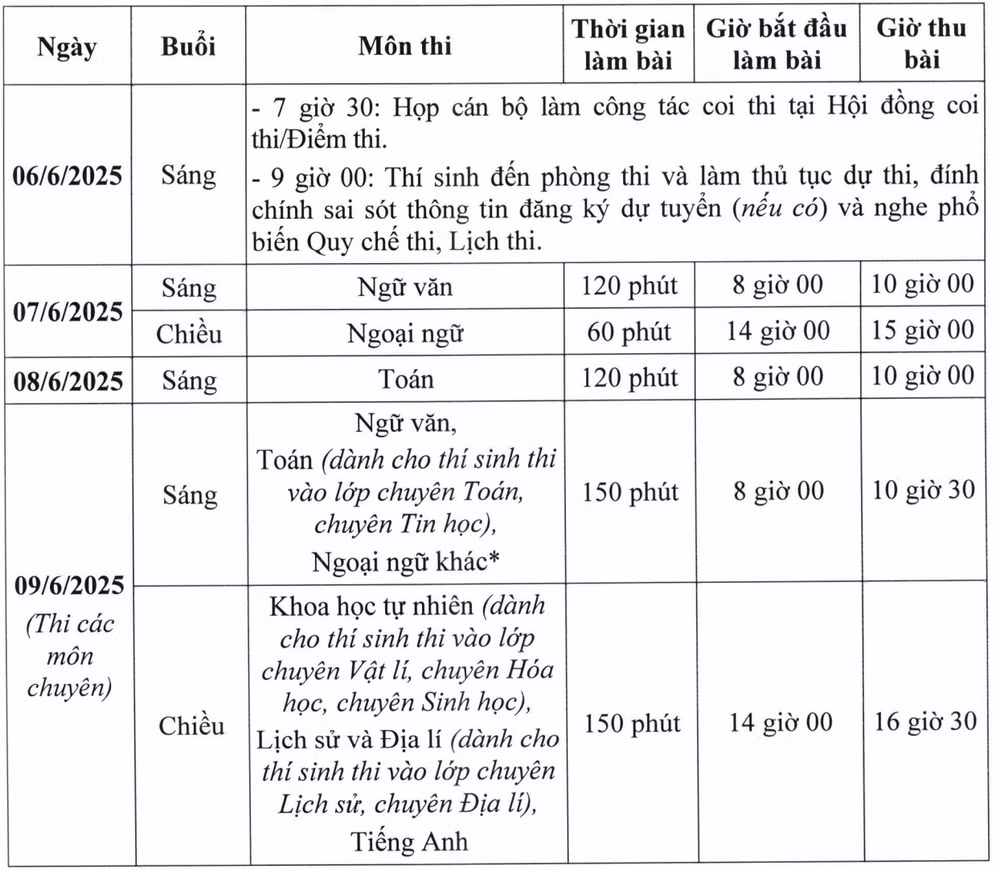 Lịch Kỳ tuyển sinh vào lớp 10 THPT năm học 2025-2026 như sau: