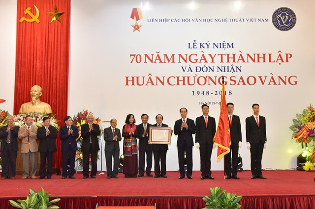 Chủ tịch nước Trần Đại Quang trao tặng Huân chương Sao Vàng cho Liên hiệp các Hội Văn học nghệ thuật Việt Nam.