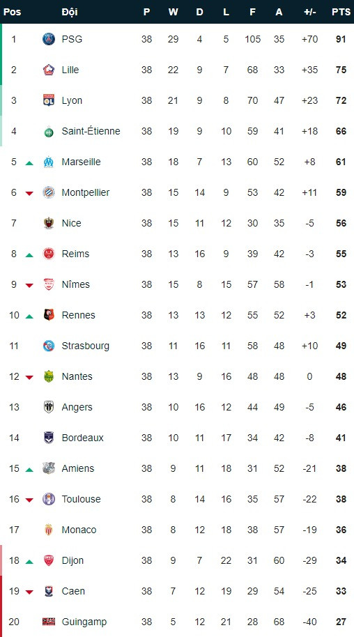Như vậy, PSG và Lille sẽ có vé vào thẳng vòng bảng Champions League mùa tới, trong khi Lyon sẽ phải đá vòng sơ loại Champions League nhưng cũng có thể kiếm được tấm vé trực tiếp vào vòng bảng nếu Chelsea đánh bại Arsenal trong trận chung kết Europa League sắp tới đây. Đội xếp thứ tư là Saint-Etienne sẽ tham dự Europa League mùa sau.