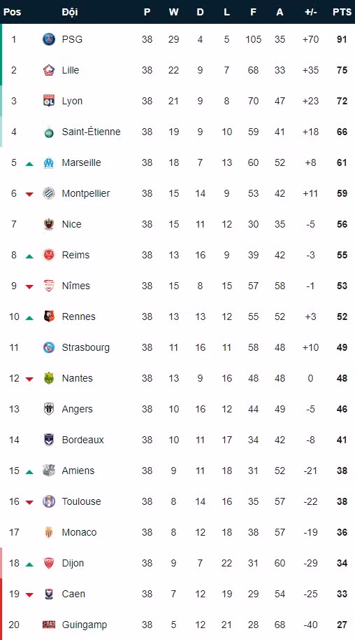 Với tất cả các vị trí dự Champions League và Europa League đã được quyết định từ vòng đấu áp chót cuối tuần trước, á quân Lille cũng để thua với tỷ số 1-3 trong tay Stade Rennes, trong khi Lyon ngược dòng giành chiến thắng 3-2 trước Nimes để cán đích ở vị trí thứ ba chung cuộc.