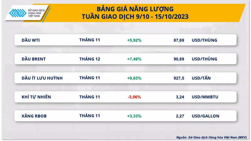 Đóng cửa tuần, giá dầu lấy lại đà tăng mạnh sau tuần lao dốc trước đó. Diễn biến căng thẳng mới trong cuộc xung đột giữa Israel và phiến quân Hamas làm dấy lên lo sợ về một cuộc chiến ủy nhiệm tại khu vực Trung Đông. Đây là trung tâm sản xuất và vận chuyển dầu lớn trên thế giới. Điều này đã thúc đẩy lực mua mạnh mẽ trên thị trường dầu mỏ.
