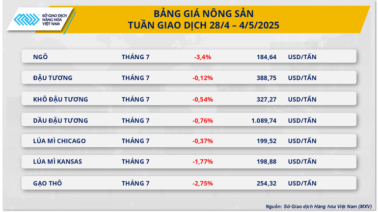 Sở Giao dịch Hàng hóa Việt Nam (MXV) cho biết, sắc đỏ bao trùm thị trường hàng hóa nguyên liệu thế giới trong tuần giao dịch vừa qua. Đóng cửa, chỉ số MXV-Index rơi mạnh hơn 2% về mức 2.169 điểm. Đáng chú ý, trên thị trường năng lượng, giá dầu thế giới ghi nhận tuần thứ 2 liên tiếp suy yếu. Không nằm ngoài xu hướng chung của thị trường, nhóm nông sản cũng chìm sâu trong sắc đỏ, trong đó nổi bật là đà suy yếu của mặt hàng ngô.