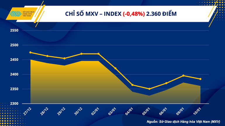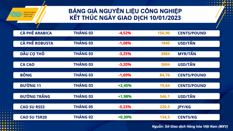Kết thúc phiên giao dịch ngày 10/1, sắc đỏ chiếm ưu thế trên bảng giá các mặt hàng nhóm nguyên liệu công nghiệp. Đáng chú ý, cà-phê Arabica nối dài đà giảm đến phiên thứ 8 liên tiếp do những áp lực từ nguồn cung.