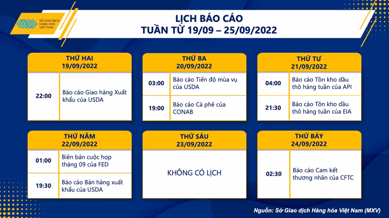 Trong tuần, số liệu từ báo cáo xuất khẩu, giao hàng hay tiến độ mùa vụ được Bộ Nông nghiệp Mỹ phát hành sẽ góp phần định hướng xu hướng giá. Riêng đối với mặt hàng cà-phê, Báo cáo Mùa vụ của Cơ quan Cung ứng Brazil CONAB vào tối ngày mai sẽ xác định bức tranh tổng quan về nguồn cung và tác động lên giá.