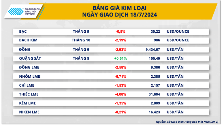 Kết thúc ngày giao dịch ngày 18/7, sắc đỏ tiếp tục bao trùm lên thị trường kim loại. Đối với kim loại quý, giá bạch kim đánh mất mốc 1.000 USD/ounce sau khi giảm 2,19%, đóng cửa tại mức 986 USD/ounce, thấp nhất một tháng. Giá bạc cũng suy yếu hơn 0,5% về 30,22 USD/ounce, mức thấp nhất hơn hai tuần qua.