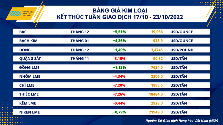 Sắc đỏ bao phủ phần lớn các mặt hàng giao dịch liên thông với Sở Giao dịch Kim loại London, trong khi các kim loại còn lại đều đón nhận lực mua tích cực. Đối với nhóm kim loại quý, kháng cự 18 USD/ounce đã hỗ trợ bạc kết thúc tuần trong sắc xanh với mức tăng 5,51% lên mức 19,07 USD/once. Bạch kim cũng có mức tăng tương đối lớn, 4,36% lên mức 933,9 USD/ounce.
