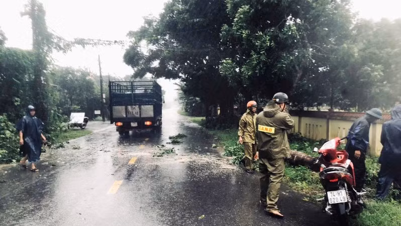 | Ban chỉ huy Quân sự TP Huế cùng dân quân thu gom cây ngã đổ trên các tuyến phố. |