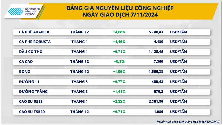 Sở Giao dịch Hàng hóa Việt Nam (MXV), cho biết sắc xanh bao phủ thị trường hàng hóa nguyên liệu trong ngày hôm qua (7/11) kéo chỉ số MXV-Index tăng 1,69% lên 2.208 điểm - mức cao nhất trong ba tuần trở lại đây. Đáng chú ý, toàn bộ 9 mặt hàng nhóm nguyên liệu công nghiệp đều đồng loạt tăng giá, trong đó dẫn đầu là ca cao bứt phá 6,3%, cà phê Arabica và Robusta đồng loạt tăng hơn 4%.