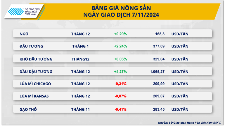 Theo MXV, nhóm đậu tương khởi sắc mạnh mẽ trong phiên giao dịch ngày hôm qua và dẫn dắt đà tăng của thị trường nông sản. Giá đậu tương hợp đồng tháng 1 tăng vọt 2,24% trong phiên hôm qua, đồng thời ghi nhận phiên tăng thứ 4 liên tiếp trong bối cảnh thị trường đón nhận kết quả xuất khẩu tích cực của Mỹ.