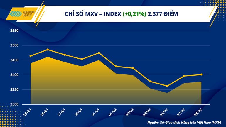Giá trị giao dịch toàn Sở đạt mức 2.800 tỷ đồng. Trong đó, dòng tiền đầu tư tập trung chủ yếu ở thị trường nông sản. Tính riêng nhóm này, giá trị giao dịch đạt hơn 1.300 tỷ đồng, chiếm đến gần 50% tổng lượng tiền của toàn thị trường.