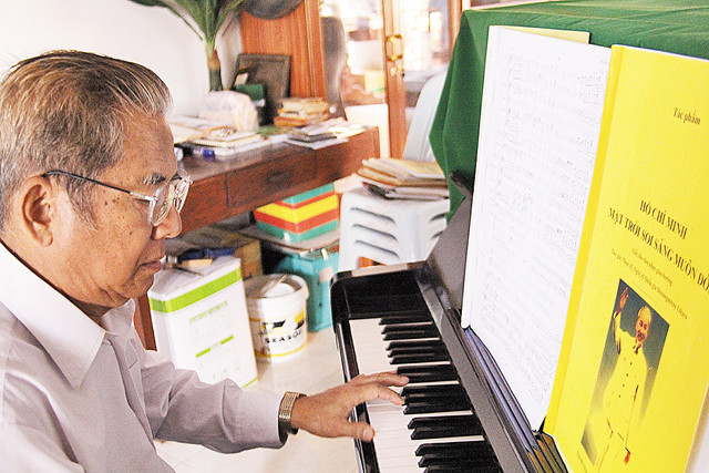 Các ca khúc về Bác Hồ có sức cuốn hút mãnh liệt Douangmixay. Thả hồn trên phím piano, ông hát tặng chúng tôi ca khúc ông thường hát khi nhớ về Việt Nam: “Sao vàng phấp phới, ánh hồng sáng tươi/ Toàn Việt Nam đón chào ngày mới…/ Hồ Chí Minh muôn năm, ngời sáng soi tương lai/ Ơn này ghi nhớ nào phai”…