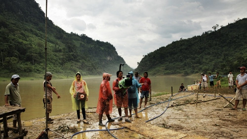 Đoàn phim gặp nhiều khó khăn và thách thức khi quay hiện trường thật những ngày mưa bão.