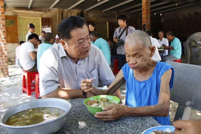 Ông Trần Châu ân cần thăm hỏi sức khỏe các cụ già vào những bữa ăn để điều chỉnh, bảo đảm dinh dưỡng phù hợp với người già.
