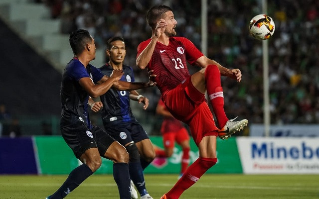 Campuchia (áo xanh) chia điểm với Hồng Kông (Trung Quốc) trong trận hòa 1-1 ở bảng C. (Ảnh: AFC)