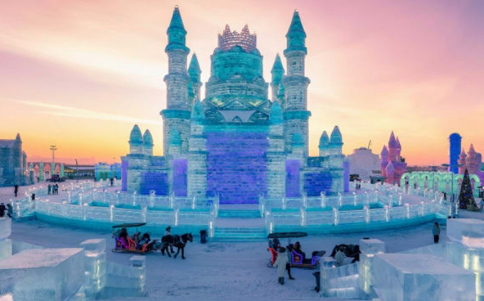 Năm nay, khu vực này được bài trí trải rộng đến 600.000m2, bao gồm hơn 100 công trình kiến trúc được làm từ 120.000m3 và 110.000m3 băng, được kéo lên từ sông Tùng Hoa ngay gần đó.