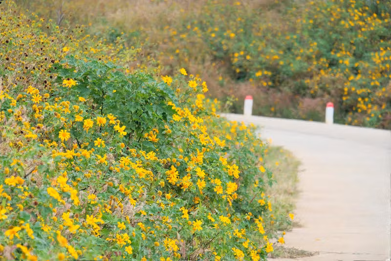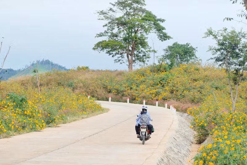 Hoa dã quỳ mọc hai bên đường dưới chân núi dẫn lên ngọn núi lửa.
