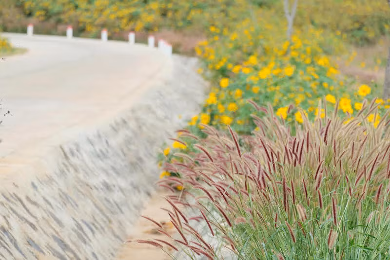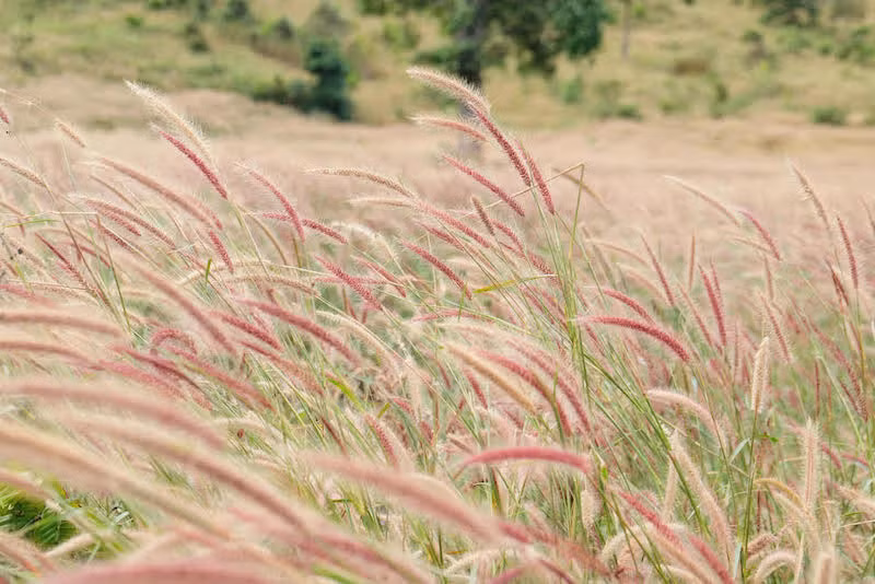 Ngoài dã quỳ du khách còn được “check in” những cánh đồng bông lau đuôi chồn màu hồng tím rất đẹp, mọc thành những cánh đồng mênh mông dưới những gốc cây cổ thụ.