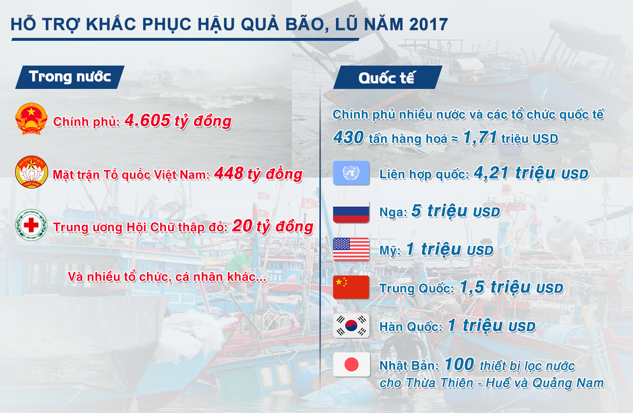 Các đợt quyên góp giúp người dân vùng lũ được phát động từ các cấp Trung ương đến địa phương. Cuộc phát động đó diễn ra từ cấp cao của Đảng, Nhà nước, Tổng Bí thư Nguyễn Phú Trọng, Chủ tịch nước Trần Đại Quang, Thủ tướng Nguyễn Xuân Phúc các cấp chính quyền cơ sở và tổ chức, cá nhân, doanh nghiệp… Tất thảy mọi người đều sẵn sàng trích những đồng lương, thu nhập của mình để cứu giúp người bị nạn. Nghĩa cử đầy cao đẹp ấy diễn ra đều đặn và đầy trân quý sau mỗi đợt bão lũ.