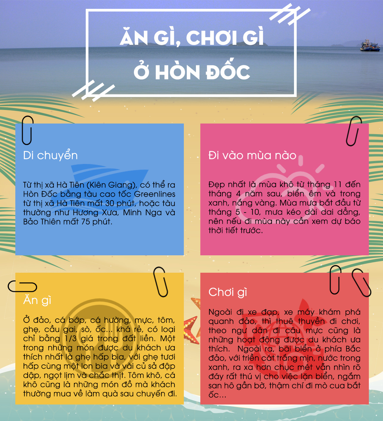 Tại Hòn Đốc, phương tiện di chuyển phổ biến nhất là xe đạp và xe ôm. Ngoài việc thuê xe ôm chạy vòng quanh đảo, với bác tài kiêm luôn hướng dẫn viên kể những câu chuyện về đảo, thì thuê một chiếc xe đạp tự khám phá rừng và biển ở Hòn Đốc cũng hết sức thú vị. Ngoài ra, thuê thuyền đi chơi một số đảo quanh đó, hoặc theo thuyền ngư dân đi câu mực, câu ghẹ, lặn biển ngắm san hô… cũng là những điều thú vị mà du khách rất thích ở Hòn Đốc.