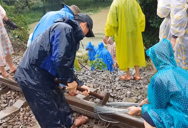 Hàng chục tấn đá được các công nhân khẩn trương cho vào rọ kè sát taluy âm của đường sắt. Chiều cùng ngày, đoạn đường sạt lở đã cơ bản được gia cố, bảo đảm giao thông đường sắt thông suốt.