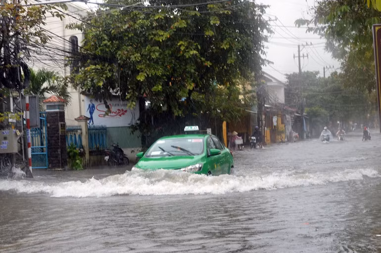 Ô tô chết máy khi qua đoạn đường ngập nước ở TP Tam Kỳ.