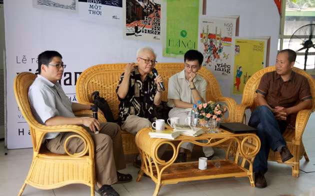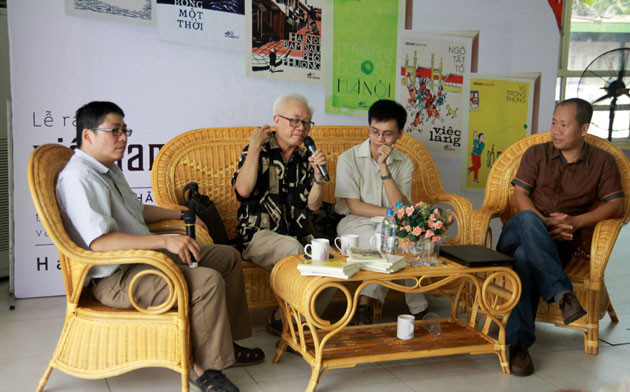 Các nhà nghiên cứu Phạm Xuân Thạch, Lại Nguyên Ân, Trần Ngọc Hiếu và Giám đốc Nhã Nam Vũ Hoàng Giang tại buổi ra mắt sách.