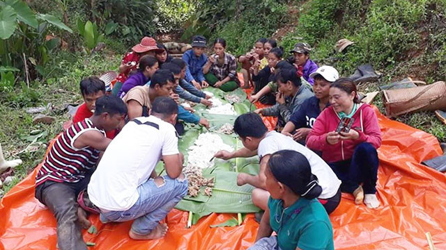 Bữa cơm trong giờ giải lao của đồng bào dân tộc Pa Cô ở xã A Bung.
