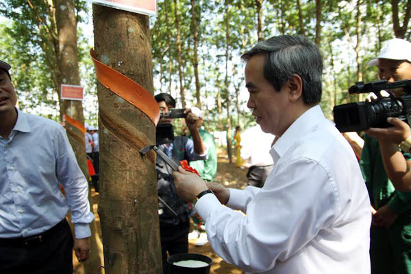 Tại đây, đồng chí Nguyễn Văn Bình cùng đại diện lãnh đạo các ban, bộ, ngành trung ương đã đi thăm thực địa, cạo mủ cao-su tại lô số 6 của Nông trường cao-su Lùng Thàng
