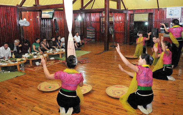 Du khách vừa thưởng thức các món ngon miền Tây Bắc vừa xem các tiết mục văn nghệ truyền thống của đồng bào Thái ở TP Điện Biên Phủ (Điện Biên).