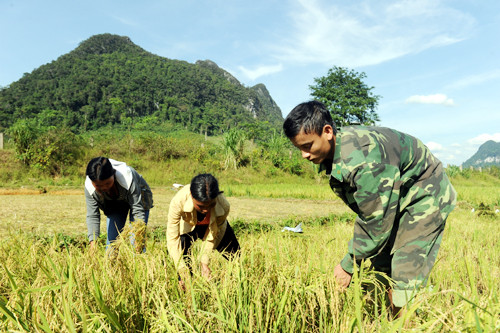 Bộ đội Biên phòng Đồn Cà Xèng (Quảng Bình) giúp đồng bào Rục thu hoạch lúa. Ảnh: NGUYỄN DUY