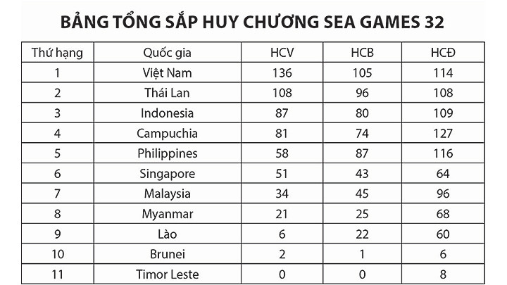 “Đoàn TTVN thành công về mặt kết quả. Chúng ta vượt trội đoàn xếp thứ hai là Thailand”, trưởng đoàn Đặng Việt Hà không giấu được sự hài lòng khi kết thúc cuộc tranh tài ở SEA Games 32. Xét về mặt thành tích, TTVN đã vượt xa chỉ tiêu ban đầu (90-120 HCV), khi xếp nhất toàn đoàn với 136 HCV. Thailand được xem là cường quốc khu vực Đông Nam Á, đứng sau với ít hơn 28 HCV.