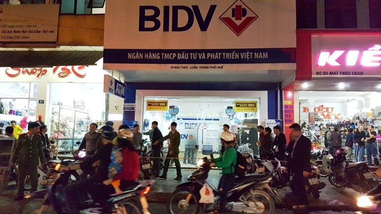 Sự việc xảy ra vào khoảng 17 giờ chiều 6-12 tại Chi nhánh Ngân hàng TMCP Đầu tư và phát triển Việt Nam (BIDV) ở số 29 đường Mai Thúc Loan (TP Huế). Thông tin ban đầu cho biết, vào thời gian trên, các nhân viên chi nhánh ngân hàng BIDV đang kiểm đếm tiền thì một đối tượng đàn ông bịt khẩu trang, xông vào ngân hàng dùng một vật như súng uy hiếp các nhân viên, lấy đi một số lượng tiền lớn với các cọc tiền 500 ngàn đồng rồi bỏ chạy.