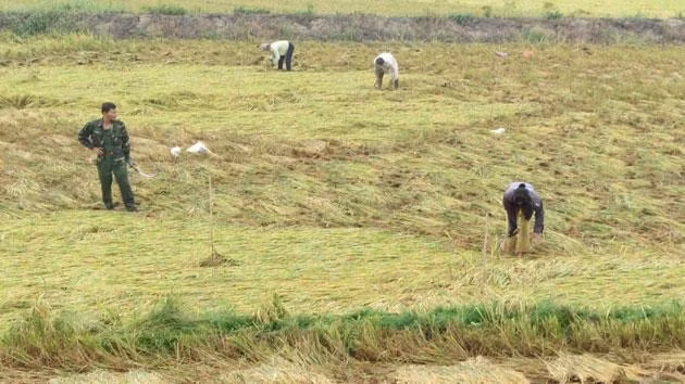 Bà Út Đẹp ở cạnh bên ruộng ông Sang, ông Hướng cũng rầu thúi ruột vì cùng chung cảnh ngộ. Máy gặt đập liên hợp không có nhiều, giờ cả cánh đồng lúa mấy nhìn công trong xã thu hoạch cùng một lúc nên không đáp ứng nổi. Hơn nữa, nước ngập sâu, khả năng “lội nước” của máy gặt đập liên hợp có hạn nên nhiều lúc cũng phải “bó tay”. “Bởi vậy hôm nay, mưa gió gì cũng cắt”, bà Đẹp nói như tuyên bố với cánh thợ gặt đang hì hụt làm việc dưới trời mưa lắc rắc.