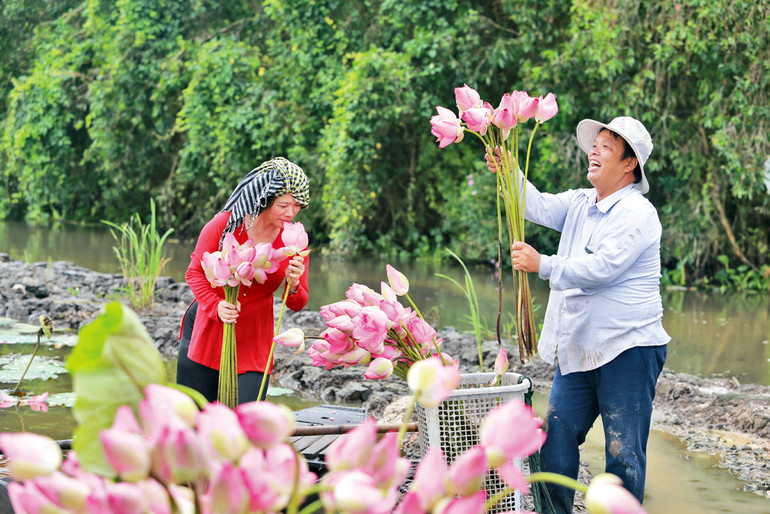 Cuối mùa nước nổi, chúng tôi theo xuồng máy của anh nông dân Võ Quốc Kỳ (ngụ tại xã Tân Lập, thị trấn Kiến Tường) vượt kênh lớn đi vào nhà anh ở sâu trong đồng, bốn bề là rừng tràm. Kỳ (còn có tên ba Kỳ), 48 tuổi, nói năng rổn rảng, giọng cười sảng khoái vang vọng đồng nước. Xuồng rẽ vào con lạch nhỏ, đồng sen rộng 13 ha nhà ba Kỳ hiện ra, ai cũng thốt kêu sững sờ vì vẻ đẹp của hàng nghìn bông sen hồng bung nở đung đưa trong nắng sớm. Nơi này gợi nhớ cuộc sống và hình ảnh vùng sông nước, ruộng đồng trong phim Cánh đồng hoang của đạo diễn Hồng Sến mấy chục năm trước. Hai nếp nhà lợp lá dừa nước nằm cuối đồng sen, nơi vợ chồng ba Kỳ và đứa con trai mười tuổi trú ngụ. Lán rộng phía trước có vài cánh võng đung đưa là nơi cho thợ hái sen, khách tham quan uống trà, nghỉ ngơi. Xuồng cập bến, ba Kỳ gọi dóng dả "Nàng ơi ra đón khách nè. Nấu cơm cho mấy chị ăn, còn chàng chèo xuồng đưa các chị đi tham quan đồng sen". Nguyễn Thị Ngọc - vợ ba Kỳ chừng 35 tuổi, cười tươi rói, đon đả ra đón khách. Ai cũng bật cười vì câu đùa "chàng, nàng" của anh nông dân miệt đồng. Cô vợ cười: "Ổng vậy đó, cả ngày chọc em cười à, ổng làm như trong phim hay tiểu thuyết vậy đó". Ba Kỳ nghe vợ nói lại cười tít mắt.