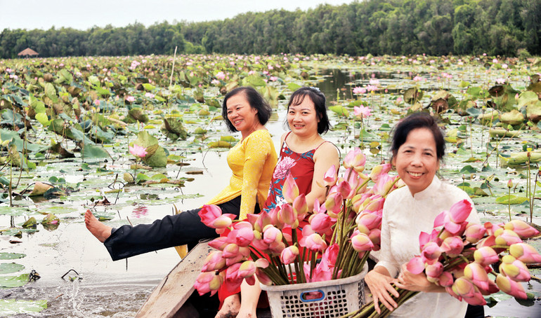 Đồng sen của vợ chồng ba Kỳ còn là "phim trường" đặc sắc của giới nhiếp ảnh và du khách. Dạo chơi trên đồng sen bằng xuồng ba lá, ghi lại những khoảnh khắc đẹp giữa đồng nước mênh mông, dưới nắng trời rực hồng những cánh sen... là những trải nghiệm thật khó quên.