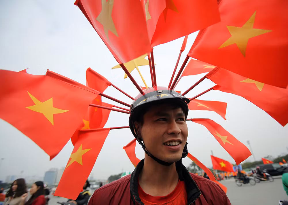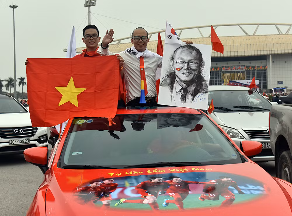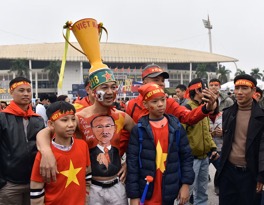 Bầu không khí náo nhiệt của trận chung kết thực sự bắt đầu. Nhiều nhóm cổ động viên đã tập trung tại khu vực trước sân Mỹ Đình. Tất cả đều sẵn sàng vào sân tiếp thêm tinh thần hưng phấn cho thầy trò huấn luyện viên Park Hang-seo. Từ lúc 13 giờ, nhiều người đã có mặt ở trước sân Mỹ Đình dù trận chung kết lượt về AFF Cup giữa tuyển Việt Nam và Malaysia còn gần sáu tiếng nữa mới diễn ra. Khắp các ngả đường hướng về sân vận động, những tiếng hò reo không ngớt vang lên. (Ảnh: DUY LINH)