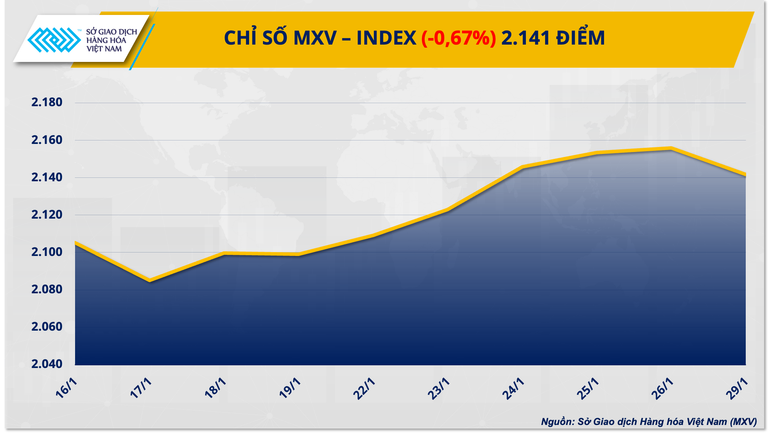 Chốt ngày, chỉ số MXV-Index hạ 0,67% xuống 2.141 điểm, kết thúc chuỗi 5 ngày tăng liên tiếp.