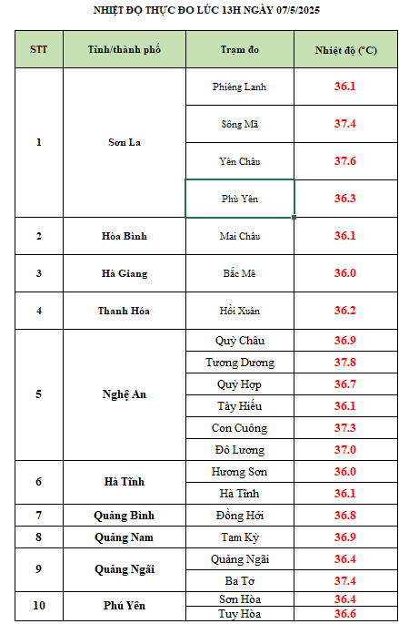 Ngày 7/5, ở khu vực Bắc Bộ có nắng nóng cục bộ, Trung Bộ có nắng nóng, có nơi nắng nóng gay gắt với nhiệt độ lúc 13 giờ phổ biến là 35-37 độ C, có nơi trên 37 độ C như: Yên Châu (Sơn La) 37.6 độ C, Tương Dương (Nghệ An) 37.8 độ C, Ba Tơ (Quảng Ngãi) 37.4 độ C,… Độ ẩm tương đối lúc 13 giờ phổ biến 50-60%.
