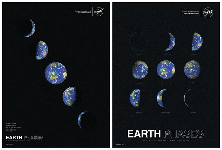 Không giống như Mặt trăng, hành tinh của chúng ta quay tròn trên trục của nó mỗi ngày. Vì vậy, ai đó trên Mặt trăng nhìn Trái đất sẽ quan sát các đặc điểm bề mặt của nó thay đổi mỗi ngày. Bộ áp phích về Trái đất này sẽ thay đổi góc nhìn về hành tinh của chúng ta khi nó được nhìn thấy từ Mặt trăng.