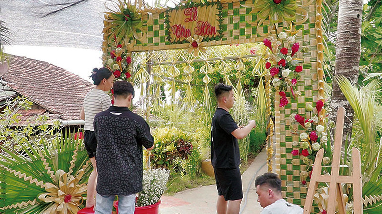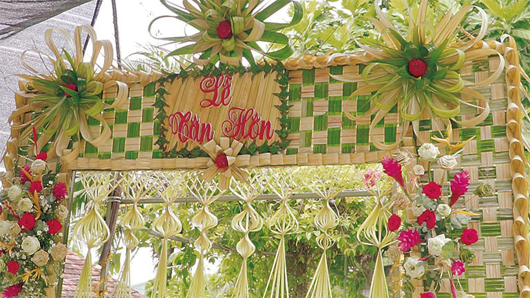 Để hoàn thành cổng cưới mất khoảng hai đến ba ngày, rồi phải bảo đảm vững chắc trước mưa gió, giữ nét tươi đẹp của hoa, lá trang trí. Dù kỳ công nhưng mọi người thường xúm xít cùng làm trong không khí rôm rả, đậm nghĩa xóm, tình làng. “Nghề” này chẳng ai dạy ai, chỉ nhìn rồi bắt chước. Những bàn tay nông dân chai sần thắt lá dừa, xếp hoa, xếp hình rất khéo léo; thậm chí, du khách nước ngoài cũng thích thú tham gia.