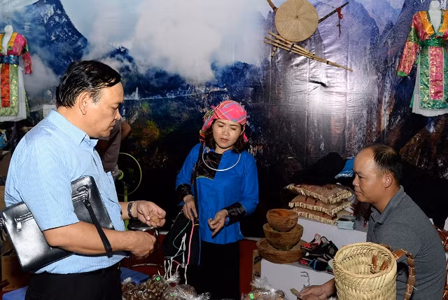 Du khách tìm hiểu về các sản phẩm thủ công mỹ nghệ của huyện Xín Mần.