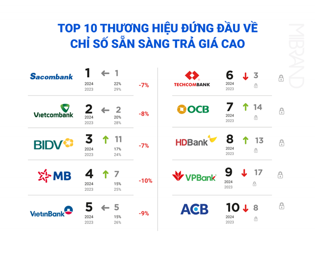 Thực tế cho thấy, năm 2024 là một năm ghi dấu những dấu ấn đầy ấn tượng của OCB trong các hoạt động từ kinh doanh, dịch vụ đến phát triển thương hiệu, khi tiếp tục khẳng định vị thế hàng đầu trong số các ngân hàng tư nhân tại Việt Nam thông qua những thành tựu nổi bật trên bảng xếp hạng sức khỏe thương hiệu. Cụ thể, chỉ số “mua hàng & sử dụng” của OCB tăng 6 bậc, vươn lên top 8, trong khi chỉ số “sẵn sàng trả giá cao” ghi nhận mức tăng trưởng ấn tượng 7 bậc, từ 21.0 lên 23.9 (hạng 7).