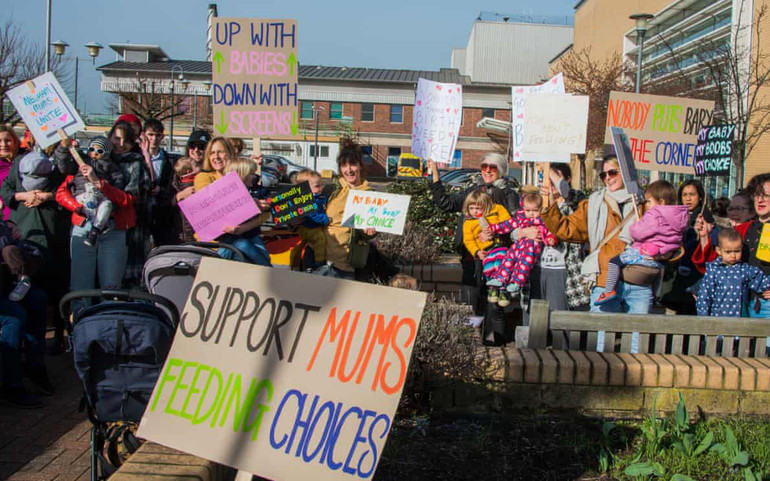 Một nhóm cha mẹ ngồi bên ngoài bệnh viện Newham, phía đông nước Anh giương cao các biểu ngữ nhằm phản đối thông tin rằng các bà mẹ phải cho con bú sau màn chắn và những đứa trẻ sẽ được cho uống sữa công thức mà không cần sự đồng ý của cha mẹ. (Ảnh: The Guardian).