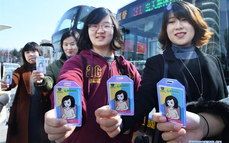 Những hành khách là phụ nữ đang mang bầu ở thành phố Thanh Đảo, tỉnh Quảng Đông, Trung Quốc trong Ngày Quốc tế Phụ nữ được nhận thẻ đi xe buýt miễn phí từ công ty vận tải địa phương. Tổng số 5.000 thẻ xe buýt được tặng cho các hành khách là phụ nữ đang mang bầu trong ngày hôm nay (Ảnh: Xinhua)