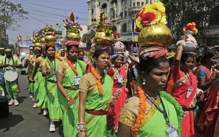 Phụ nữ trong trang phục truyền thống tham dự buổi tuần hành kêu gọi nữ quyền nhân Ngày Quốc tế Phụ nữ tại bang Kolkata, Ấn Độ (Ảnh: AP)
