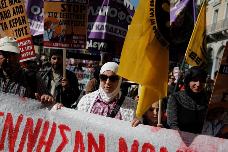 Phụ nữ nhập cư người Syria tuần hành trên đường phố Athen, Hy Lạp trong Ngày 8-3 (Ảnh: Reuters)