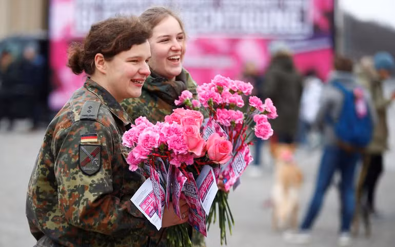 Hai nữ binh sĩ thuộc Lực lượng vũ trang Đức tặng hoa cho những người phụ nữ ở cổng Brandenburg vào Ngày Quốc tế Phụ nữ, Berlin, Đức (Ảnh: Reuters)