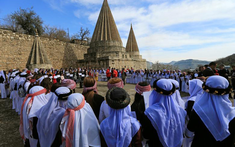 Những người phụ nữ Yazidi tham dự một buổi lễ tại đền Lilash để tưởng nhớ cái chết của những phụ nữ bị phiến quân Nhà nước Hồi giáo giết hại, trong Ngày Quốc tế Phụ nữ, tại Shikhan phía bắc Iraq. (Ảnh: Reuters)