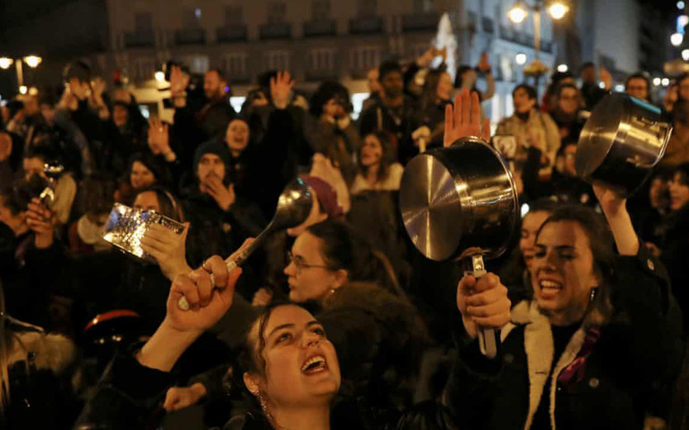 Phụ nữ xuống đường với cả nồi, xoong, chảo bắt đầu cuộc tuần hành vì nữ quyền nhân ngày Quốc tế Phụ nữ ở quảng trường Puerta del Sol, Madrid, Tây Ban Nha. (Ảnh: Reuters)