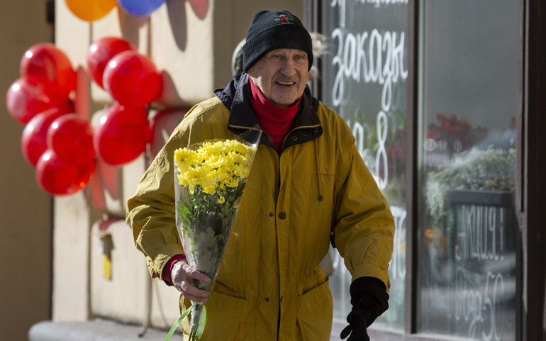 Một cụ ông với bó hoa trên tay trên đường phố thủ đô Moscow, Nga trong Ngày Quốc tế Phụ nữ (Ảnh: AP)